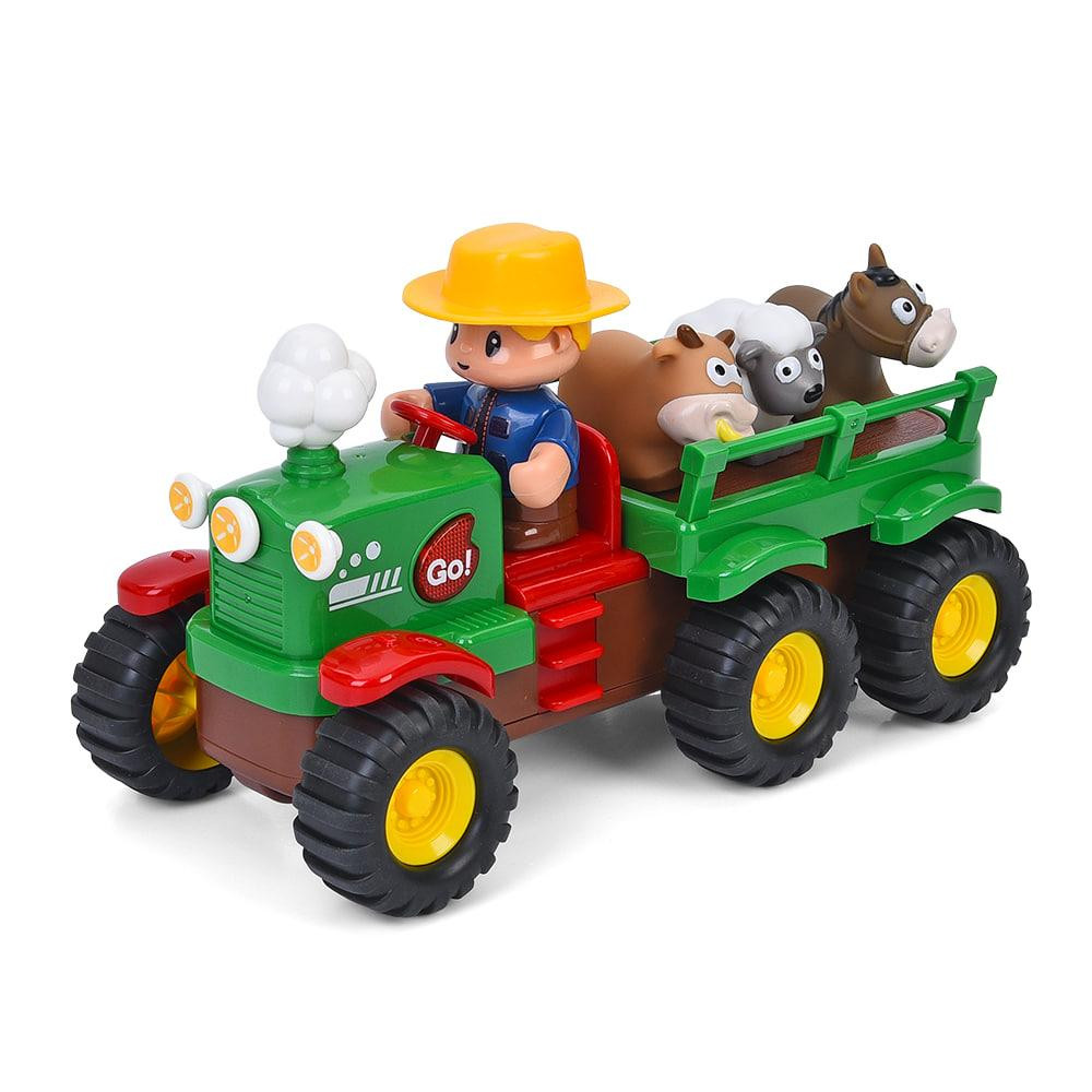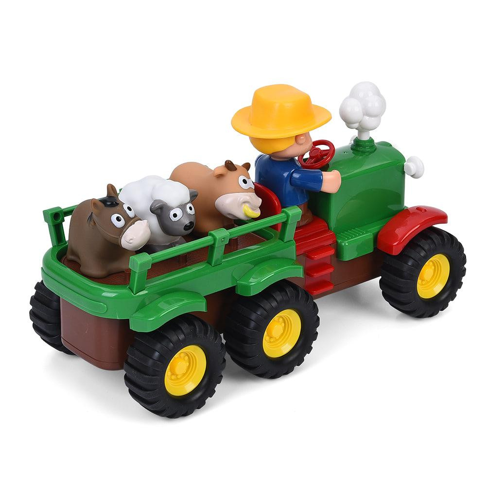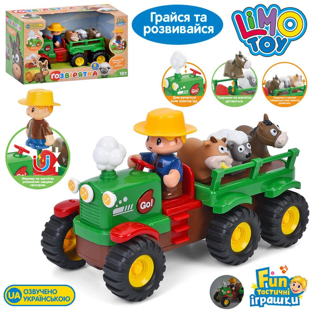 Іграшковий трактор з причепом Limo Toy M 6303 — це функціональна модель сільськогосподарської техніки з українським озвученням. Трактор їздить, має світлові та звукові ефекти, а також знімну фігурку фермера з магнітним кріпленням. У комплекті є 3 фігурки тварин. Під час руху платформа у причепі рухається, а елемент диму створює додатковий реалістичний ефект.