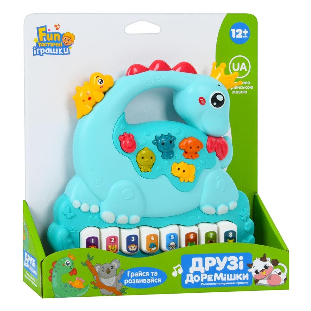 Яскраве музичне піаніно у формі динозавра стане цікавою розвагою для малюка. Іграшка відтворює музику, звуки та вірші українською мовою, має світлові ефекти та зручний розмір 17 см.