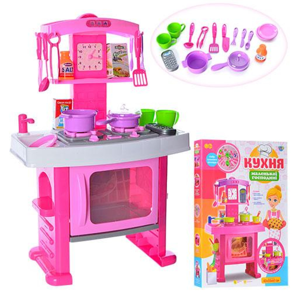 • Комплектація: плита, духовка, сковорідка, кухонне приладдя, чашки та блюдця — 2 шт., годинник