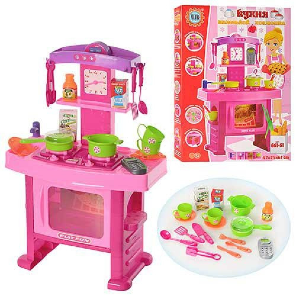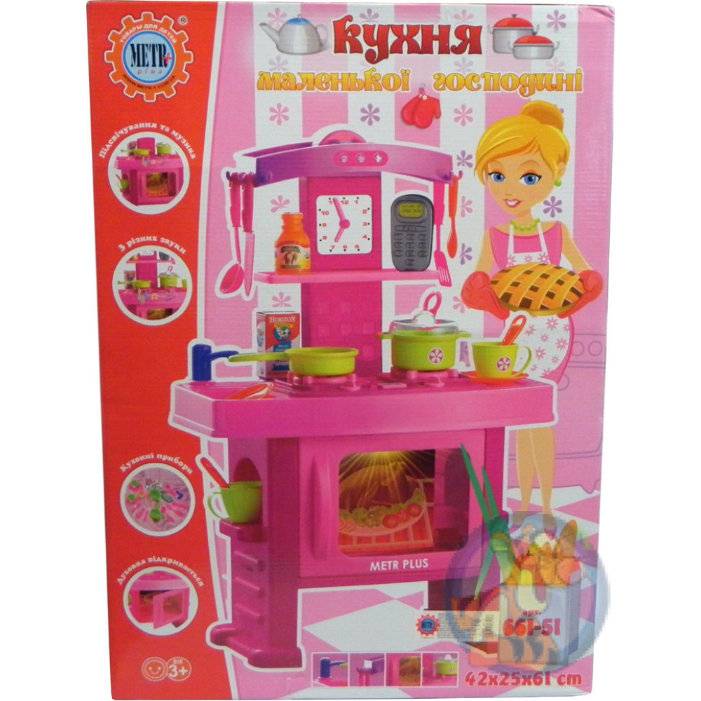 Дитяча кухня 661-51 від фірми Metr+ — це інтерактивний ігровий набір для дівчаток від 3 років. Кухня допомагає дитині весело проводити час, водночас знайомлячи з першими побутовими навичками. Вона оснащена музичними ефектами та працює від батарейок типу АА (не входять до комплекту).