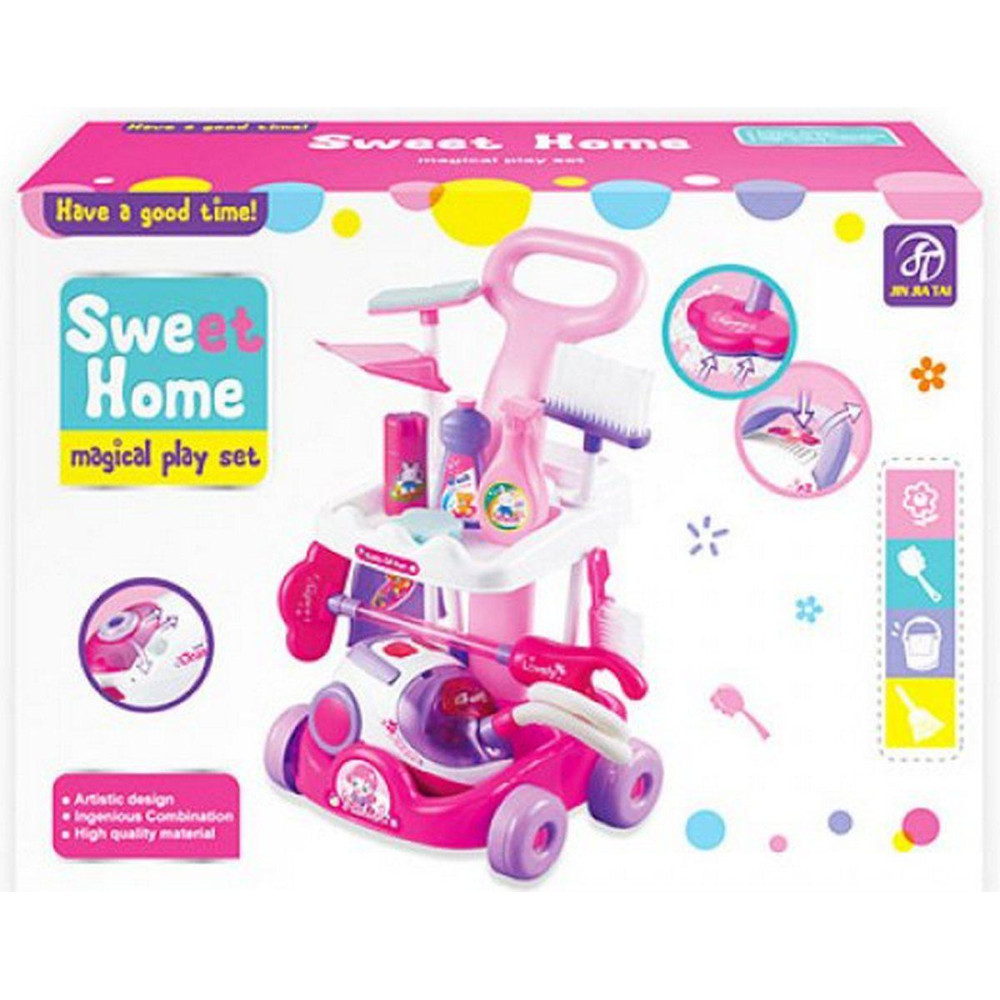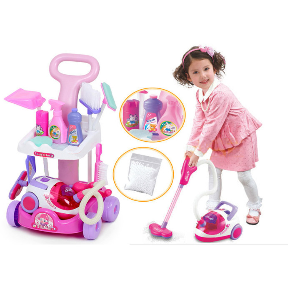 • Комплектація: пилосос (18 см), совок для сміття, 2 щітки для прибирання, швабра, серветка для витираня пилу, пляшечки, візок із коліщатками для кріплення приладдя