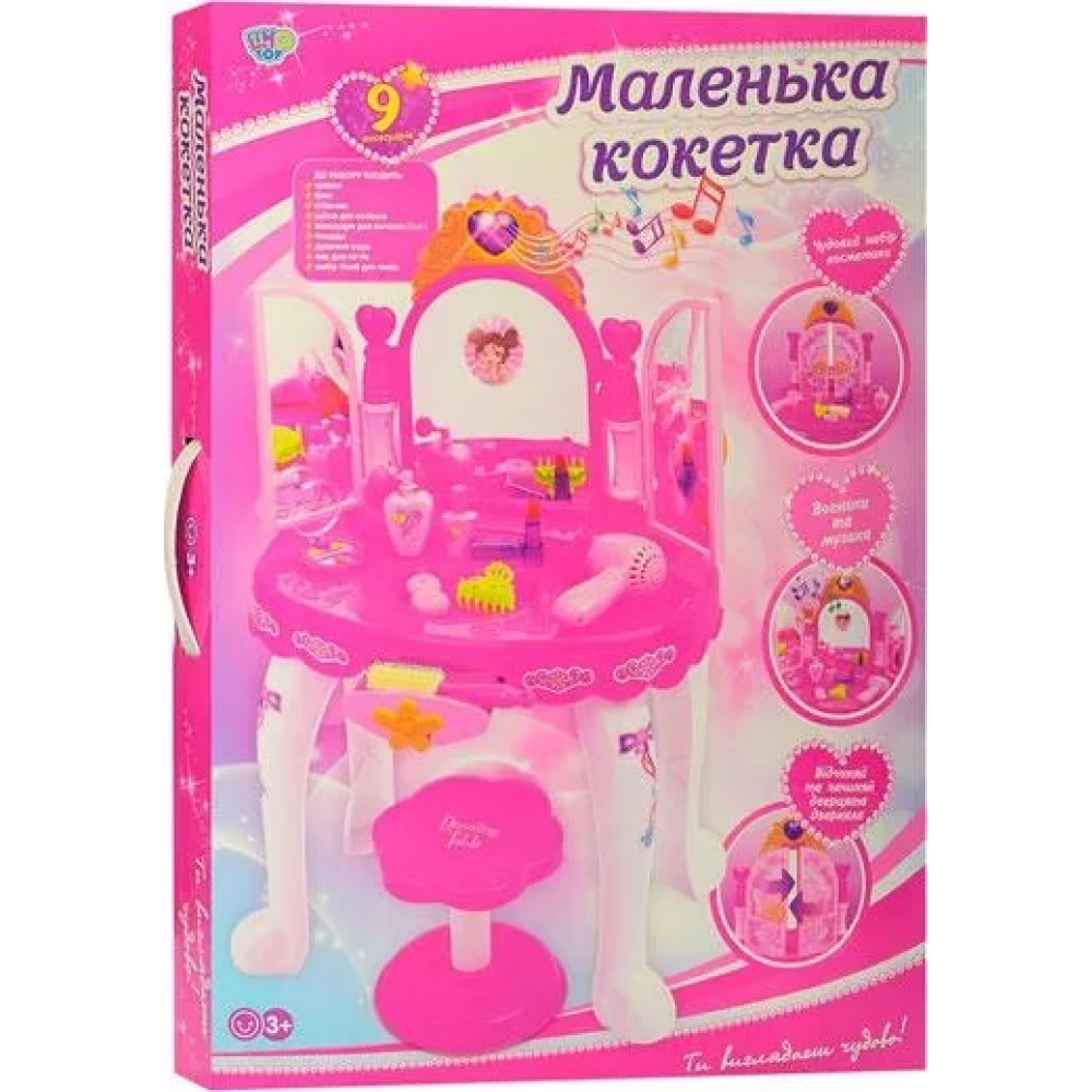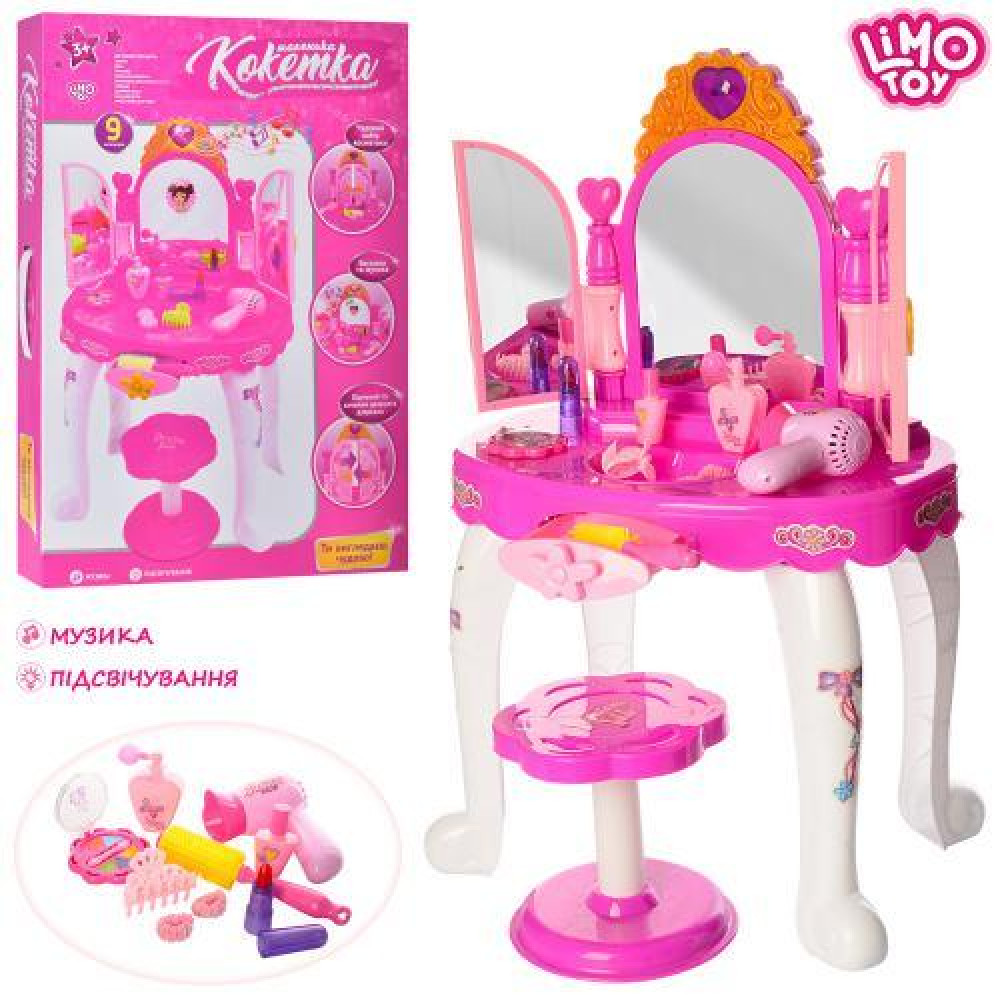 Трюмо 16632C — подарунок, про який мріє будь-яка дівчинка. Малеча відчує себе справжньою принцесою, змінюючи свій образ або граючи з подружкою в перукаря. У трюмо вбудоване безпечне дзеркало, що не б’ється, зі стулками, які відкриваються. Набір включає фен зі звуковими ефектами, гребінець, прикраси, косметику, духи та стілець для зручної гри. Трюмо також має світлові та звукові ефекти, що робить гру ще цікавішою.