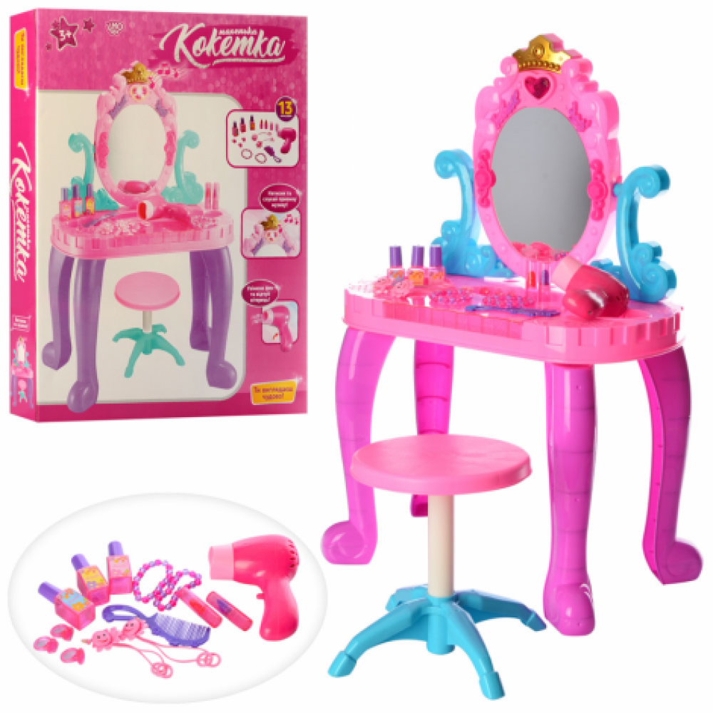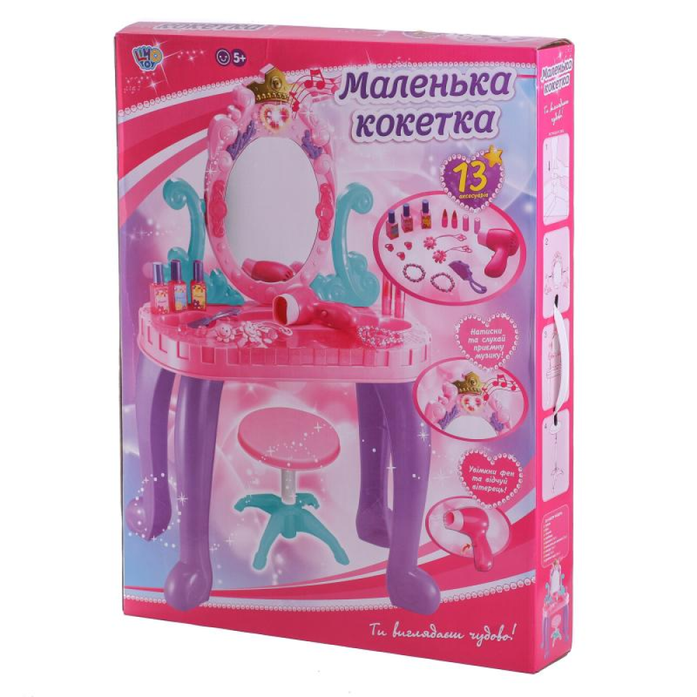 Трюмо 661-39 — бажаний подарунок для кожної дівчинки. З таким набором маля відчує себе справжньою принцесою, зможе змінювати свій образ або грати з подружкою в перукаря. У трюмо вбудоване безпечне дзеркало, що не б’ється. Набір доповнений феном зі звуковими ефектами, аксесуарами та стільчиком для зручної гри. Світлові та звукові ефекти роблять гру ще більш захопливою.