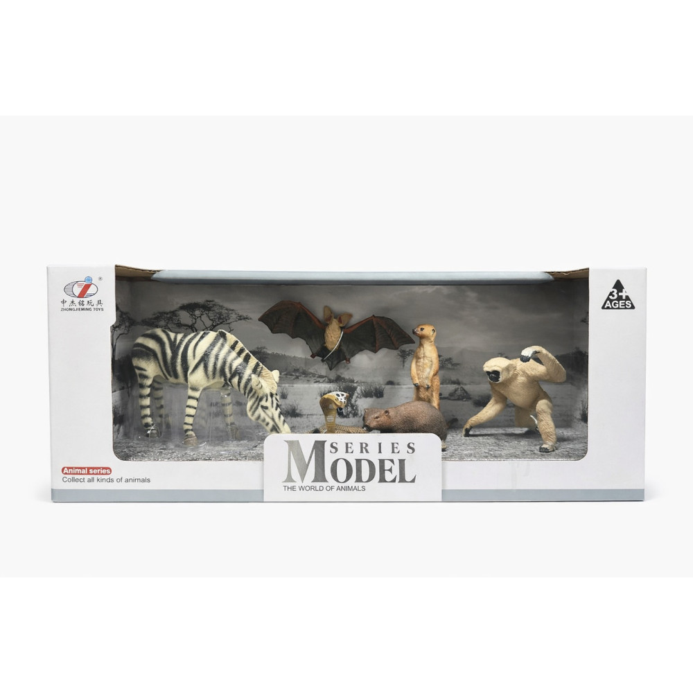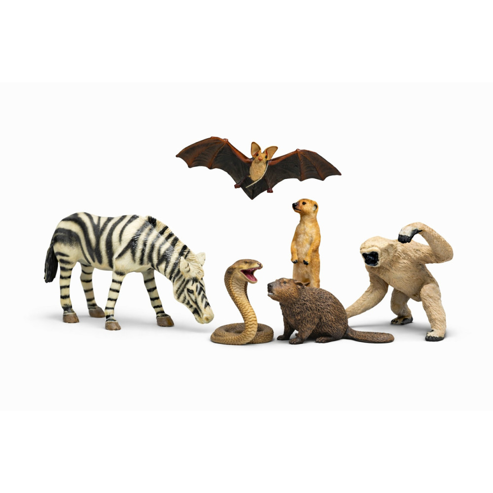 У наборі представлено 6 тварин: зебра, кажан, сурикат, кобра, бобер і горила. Кожна фігурка має стійку форму та приємну на дотик поверхню, що ідеально підходить для активних сюжетних ігор і колекціонування.