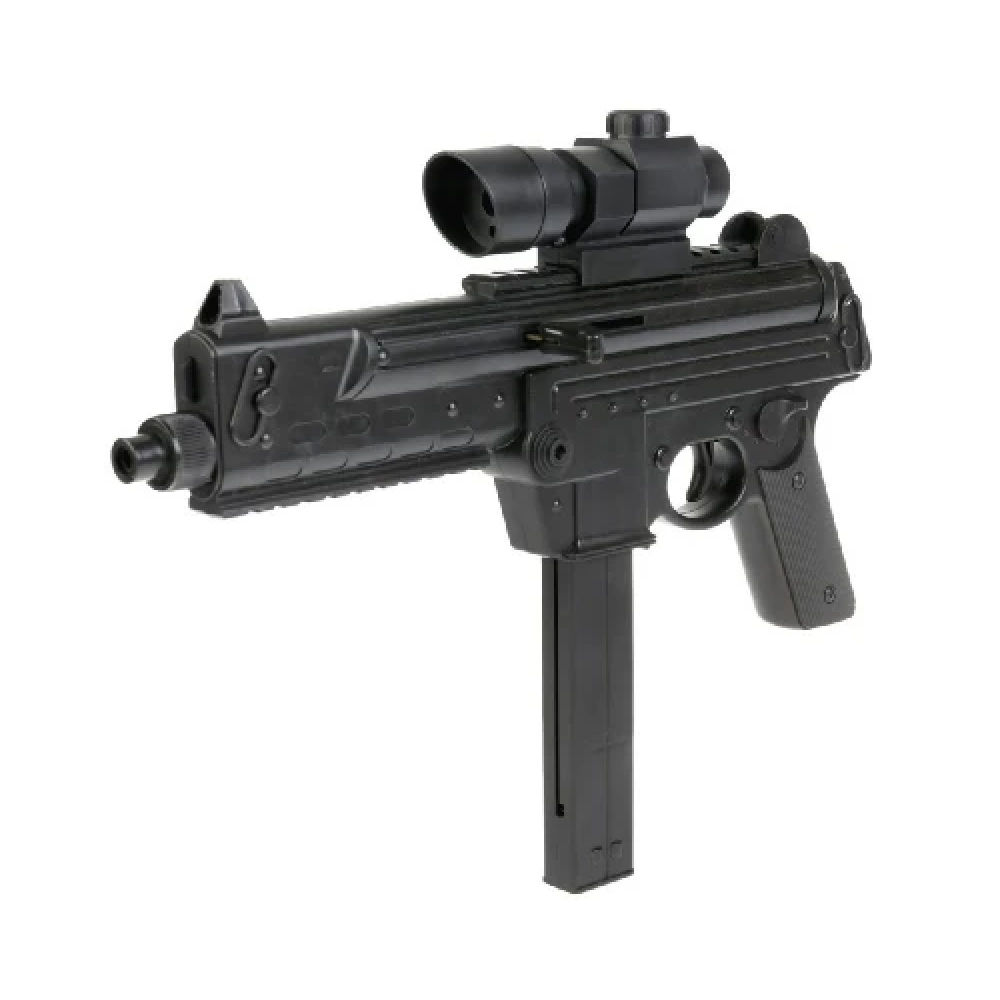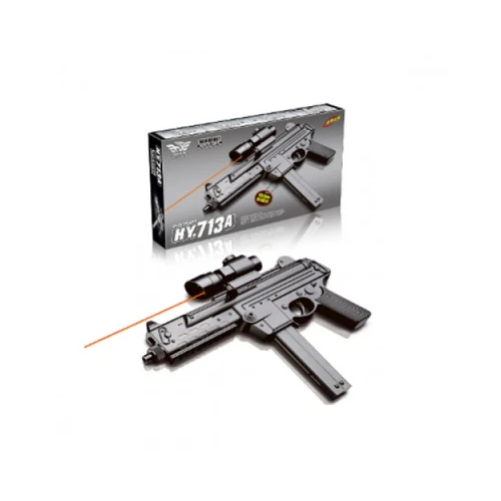 Дитячий іграшковий автомат 713A — це компактна модель розміром 35 см, виконана з міцного пластику. Він оснащений лазерним прицілом і знімним глушником, що додає реалістичності. Автомат стріляє пластиковими кульками діаметром 6 мм за допомогою ударно-пружинного механізму: після кожного пострілу необхідно вручну пересмикнути затвор.
