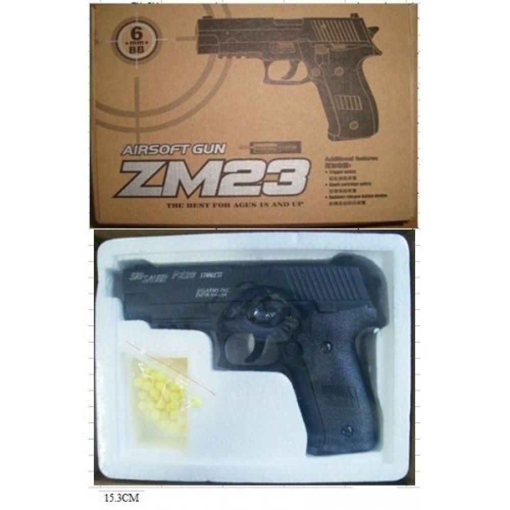 Іграшковий пістолет на кульках ZM23 — це реалістична модель, що імітує пістолет SIG Sauer P226. Виготовлений з металу з пластиковими елементами, він має пружинний механізм для стрільби пластиковими кульками діаметром 6 мм. Пістолет оснащений рухомим затвором, запобіжником та зручним магазином.