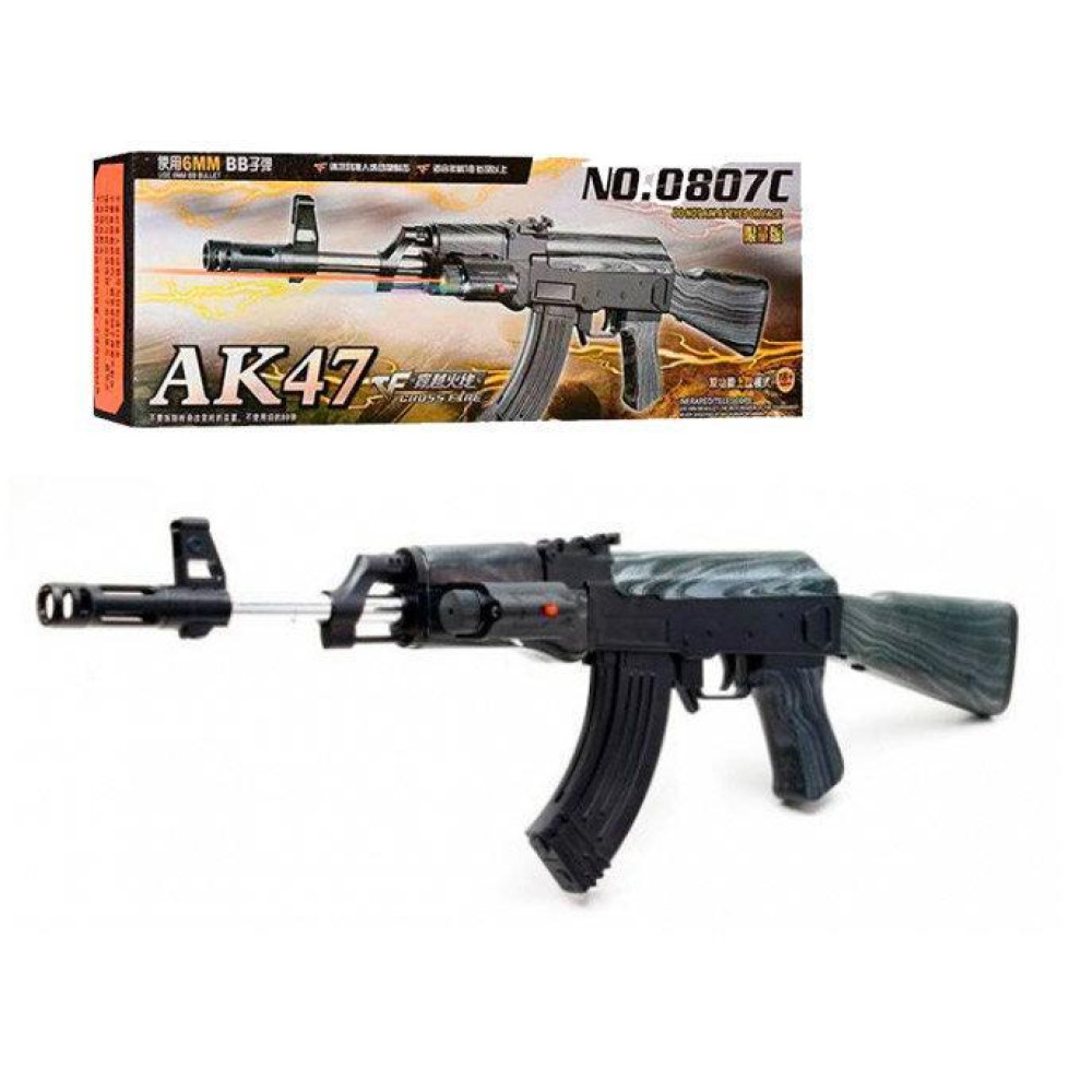 Ігровий дитячий страйкбольний автомат АК-47 0807C — це механічна іграшка, що імітує зовнішній вигляд оригінальної зброї. Виготовлений з міцного пластику, він оснащений лазерним прицілом для покращення точності прицілювання. Автомат стріляє пластиковими кульками діаметром 6 мм, що забезпечує безпечну гру.