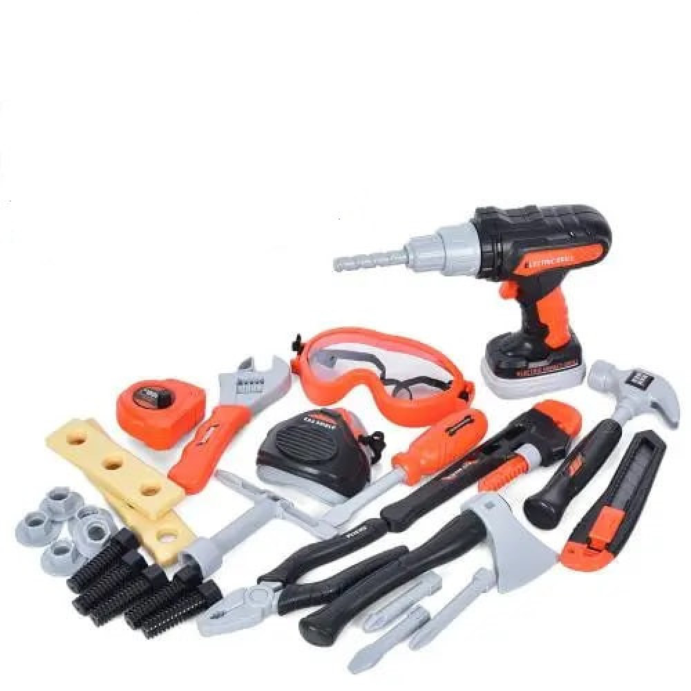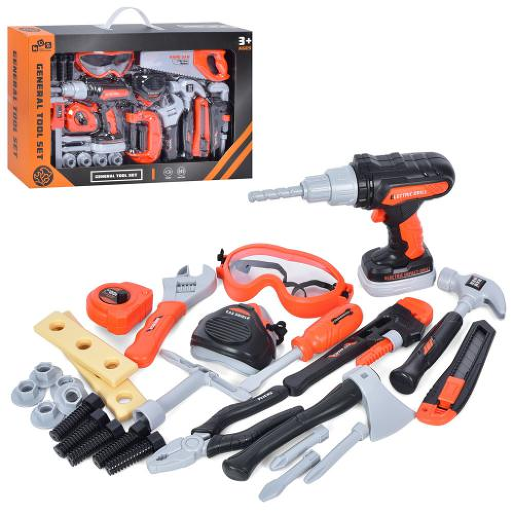 комплектація 24–27 предметів (молоток, викрутки, ключі, пила, дриль з батарейками, інші аксесуари)