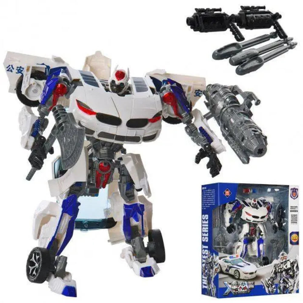 Іграшка, що поєднує функції поліцейської машини та бойового робота. Виготовлений з міцного пластику, він має стильний білий колір з яскравими акцентами. Перетворення між формами відбувається вручну, що дозволяє дитині самостійно змінювати вигляд іграшки.