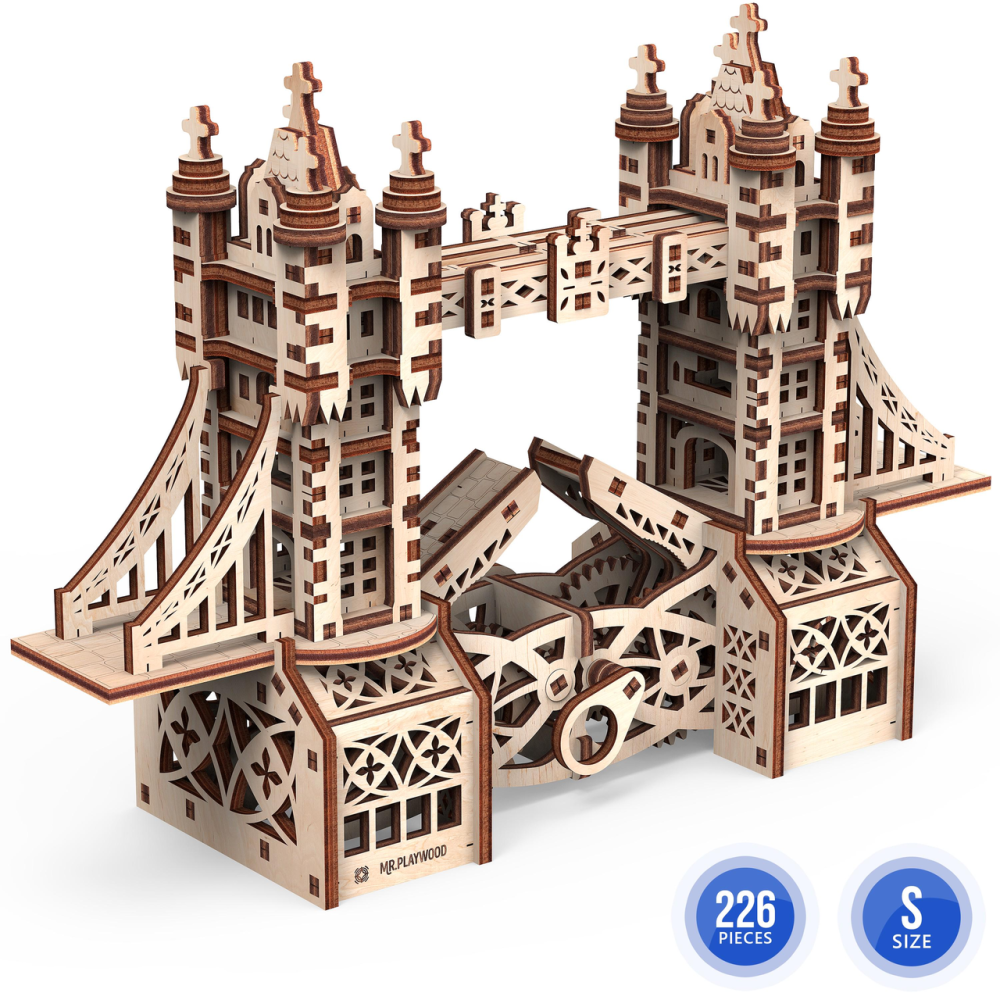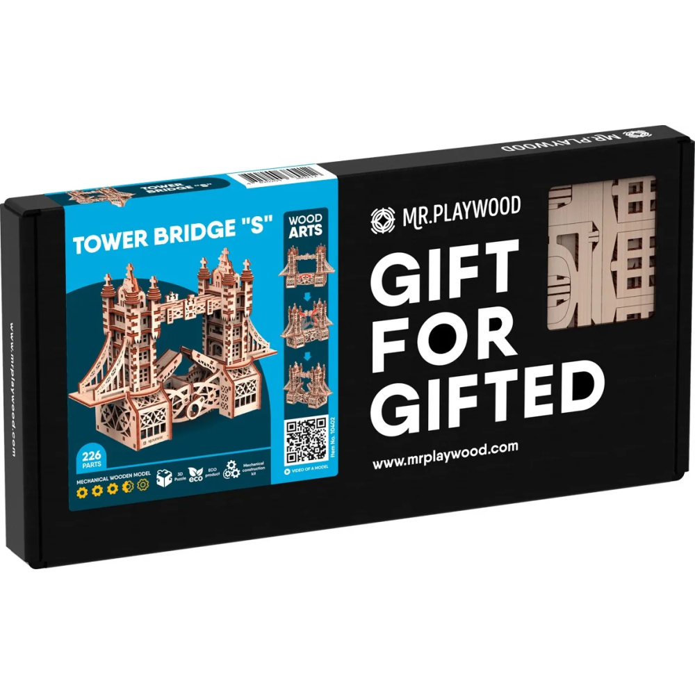 Конструктор 3D дерев'яний механічний Mr.Playwood Тауерський міст 10402 – це захоплюючий набір для складання однієї з найзнаменитіших пам'яток Лондона. В комплект входить 226 деталей із міцного, екологічно чистого дерева, які легко з'єднуються без клею та спеціальних інструментів. Після збирання виходить деталізована модель легендарного Тауерського мосту – символу британської столиці.