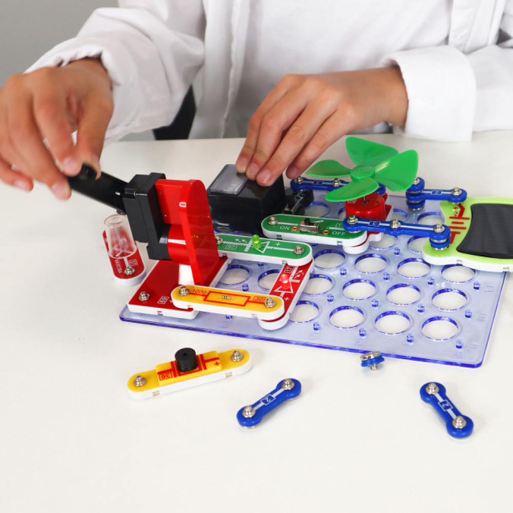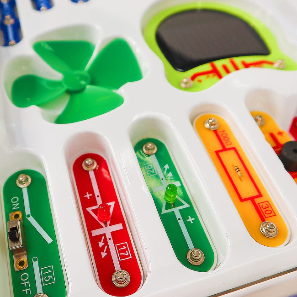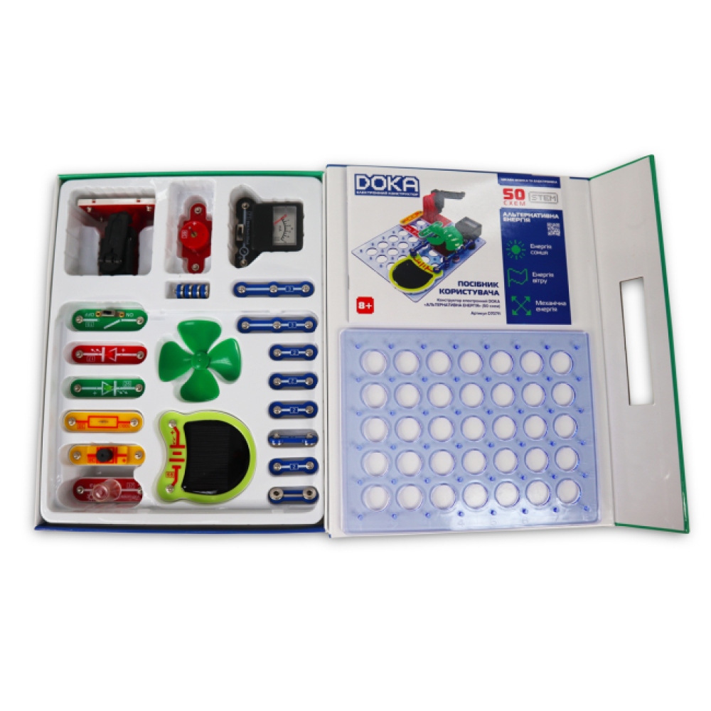 Цей конструктор дозволяє зібрати 50 різноманітних схем без пайки, використовуючи енергію сонця, вітру та механічну енергію. Він сприяє розвитку логіки, уваги, пам’яті та дрібної моторики у дітей.