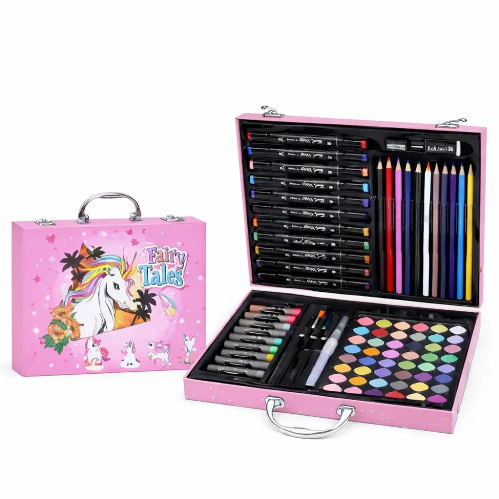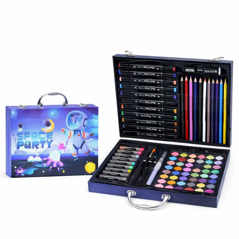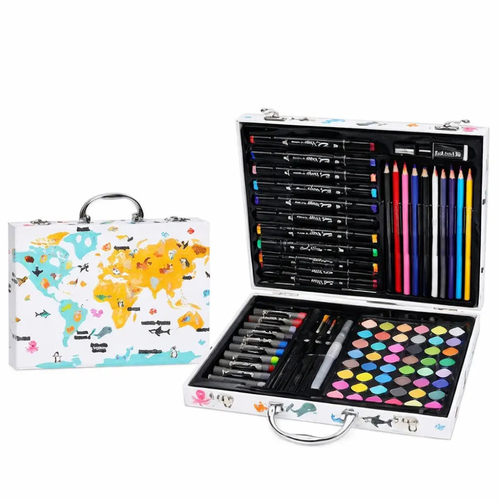 Набір для творчості MK 5386-2- це універсальний художній комплект для дітей, зібраний у зручній та яскравій валізі. Усередині знаходяться акварельні фарби (у кюветах і тюбиках), кольорові фломастери, воскова крейда, кольорові олівці та інше приладдя. Такий набір надихає на творчість, розвиває художні навички та відмінно підходить як для дому, так і для занять у школі чи дитячому садку.