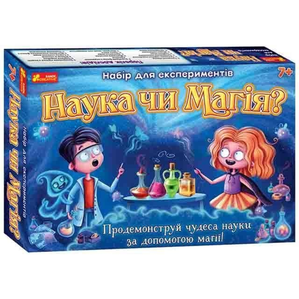 Набір експериментів Ranok Creative «Наука або магія» (артикул 12114096У) — пізнавальний комплект для дітей від 7 років, який поєднує елементи магії та фізики, дозволяючи проводити захоплюючі досліди вдома.