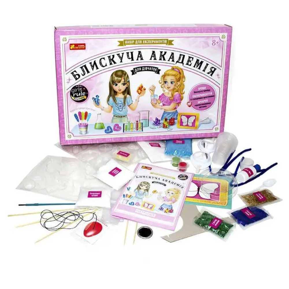 Набір для експериментів «Блискуча академія для дівчаток» (артикул 12114121У) від Ranok-Creative — це творчий комплект, який дозволяє провести 9 безпечних та цікавих дослідів з вирощування кристалів та створення блискучих виробів.