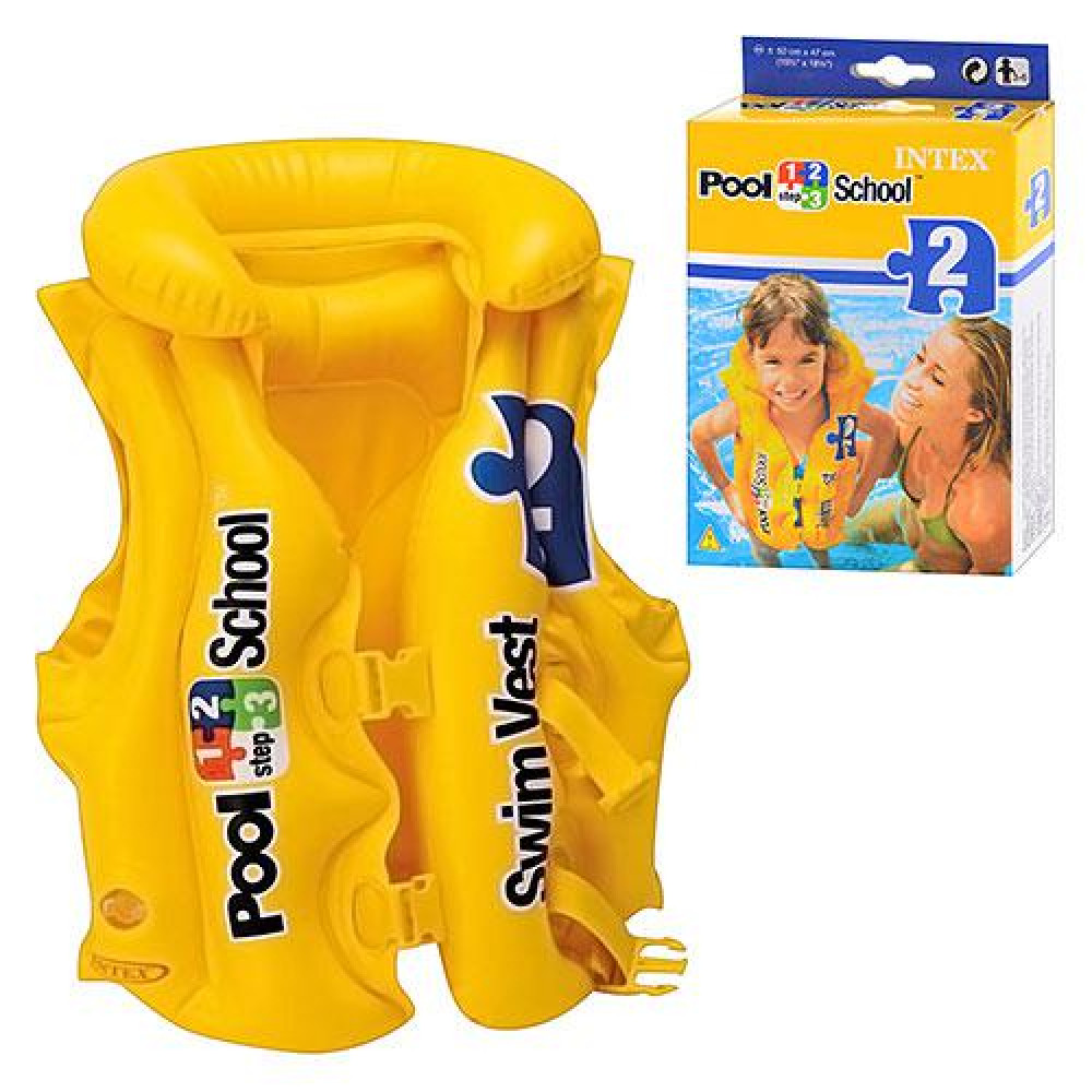 Надувний дитячий жилет Intex 58660 серії "Pool School" — аксесуар для дітей від 3 до 6 років, створений для безпечного навчання плаванню. Яскравий жовтий колір забезпечує хорошу видимість у воді, що полегшує спостереження за дитиною.