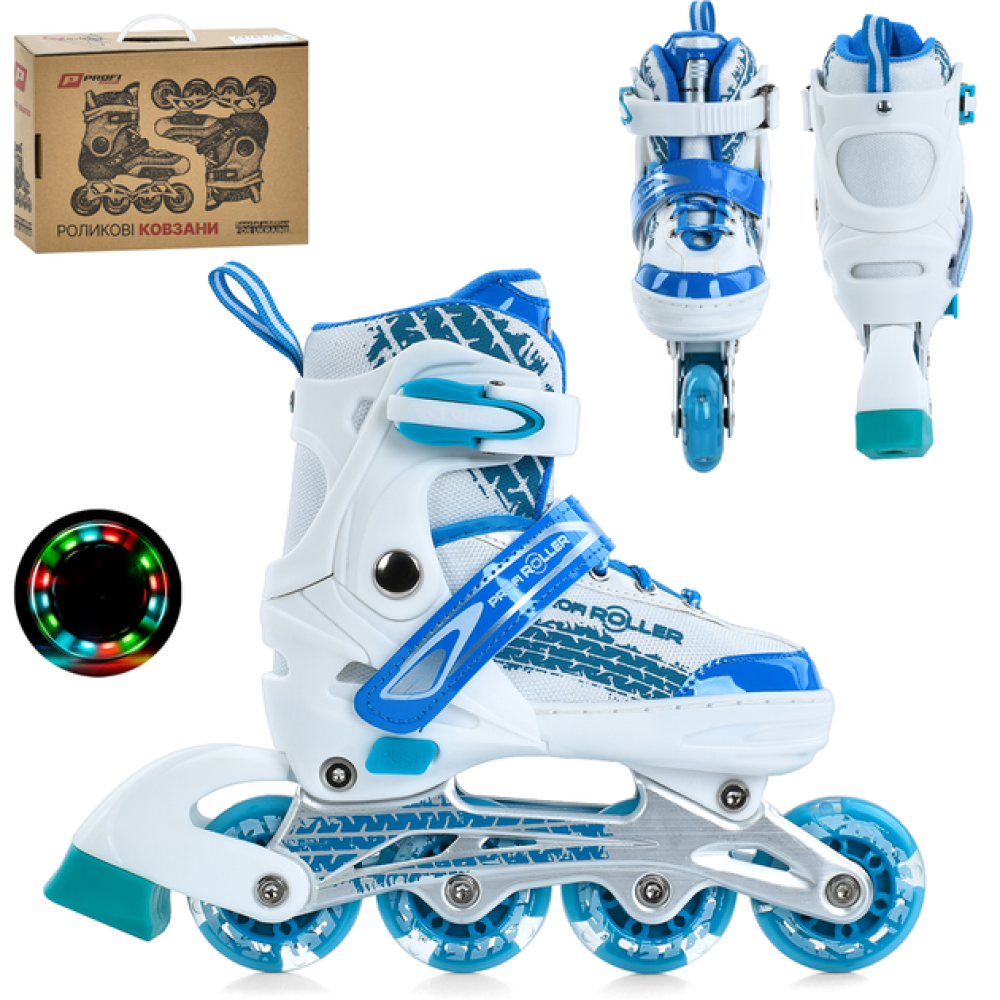 Ролики Profi A4150-S-WBL — ідеальний вибір для дітей, які починають освоювати катання. Модель оснащена зручною системою шнурівки та баклею для надійної фіксації стопи. Легка алюмінієва рама забезпечує міцність і стійкість. Колеса з поліуретану (ПУ) діаметром 64 мм з підсвіткою додають яскравості під час катання. Устілка довжиною 18,5 см забезпечує комфорт. Ролики постачаються в компактній коробці розмірами 34 × 27,5 × 10,5 см.