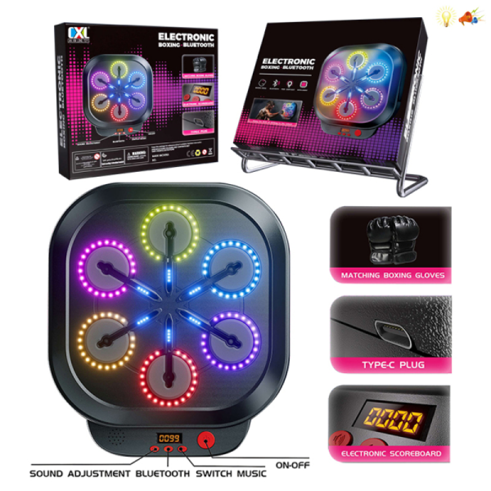 Бокс має інтерактивну м’яку дошку, яка реагує на удари, підсвічуючи зони для тренування. Звукові ефекти створюють атмосферу справжнього боксерського залу, а через Bluetooth можна підключити музику для мотивації.